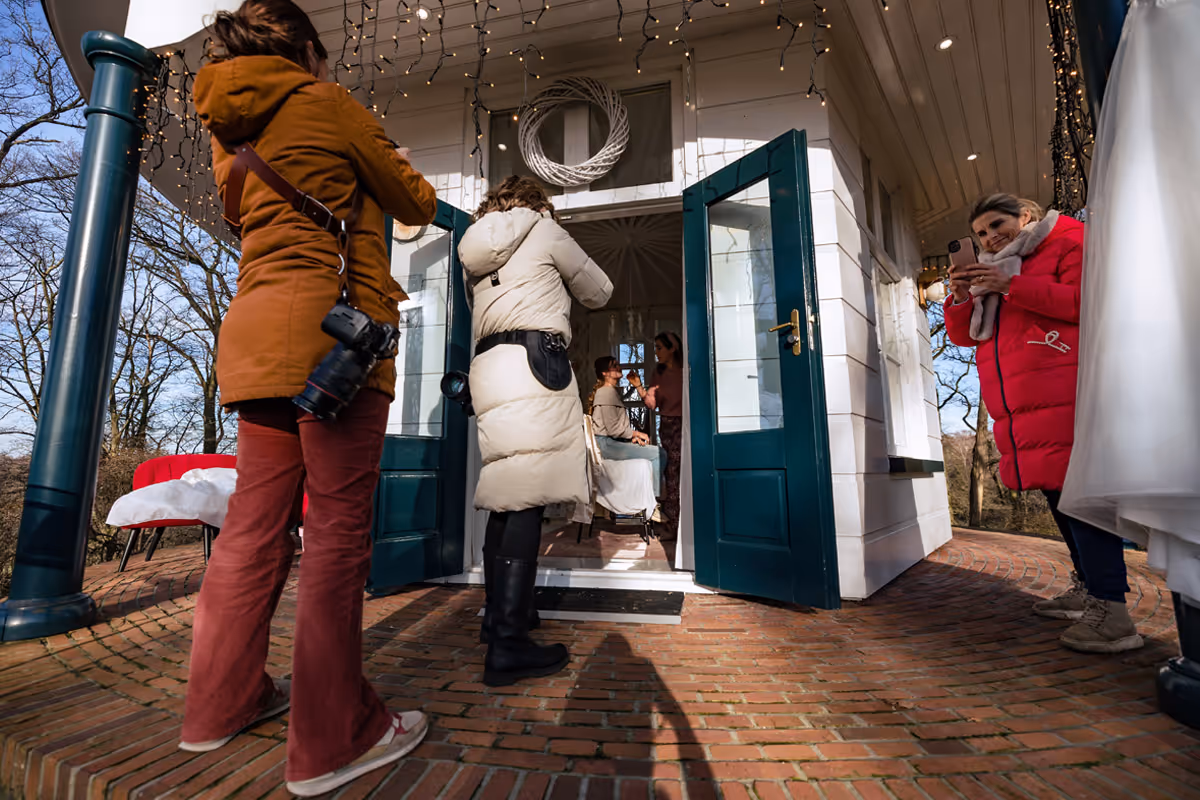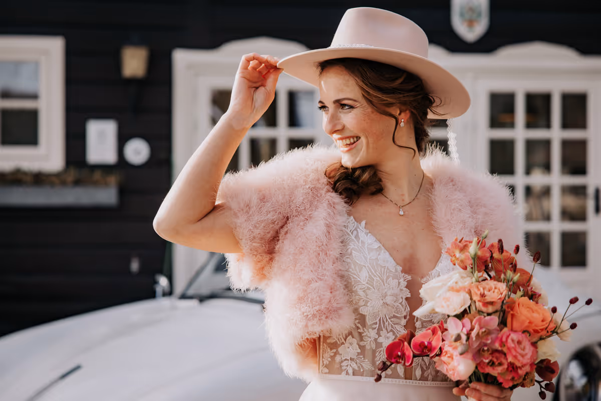 Wat wij een super leuk detail vonden is dat het roze zelfs terug komt in de mooie jurk van de bruid, deze heeft een zacht roze gloed. En ook het bontje en de hoed bij aankomst gaan heel leuk op in dit roze. Vind jij roze ook zo'n super leuke kleur maar wil je toch geen overkill voor je aanstaande? Dan zijn dit misschien wel de perfecte beelden om inspiratie uit te halen!