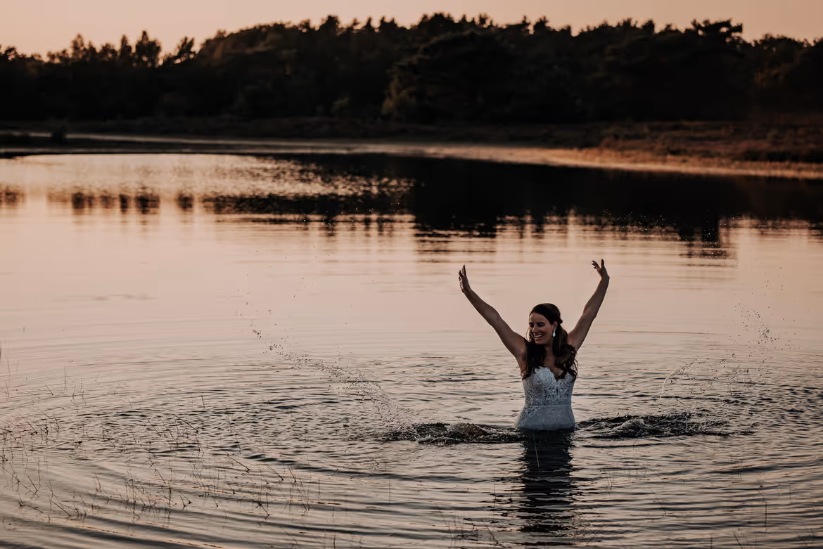 Alleen dit keer hoef je niet zo voorzicht te zijn of de sleep of onderkant van je jurk vies wordt 😉 Dus wacht nog even met het naar de stomerij brengen van jouw trouwjurk! Wij vinden het in ieder geval de moeite waard en het levert fantastische foto’s op.