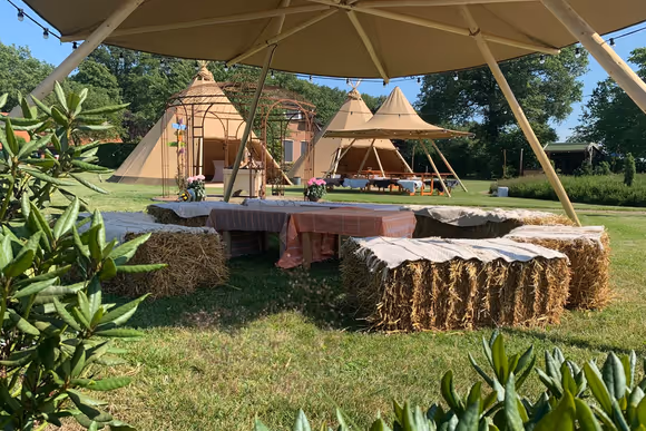 Begin jullie droombruiloft met een intieme ceremonie in een Tipi Seto, ook wel bekend als de “tentparasol.” Perfect voor een romantische en intieme ceremonie. Deze tent heeft een magische beleving die jullie gasten nog lang zullen herinneren.